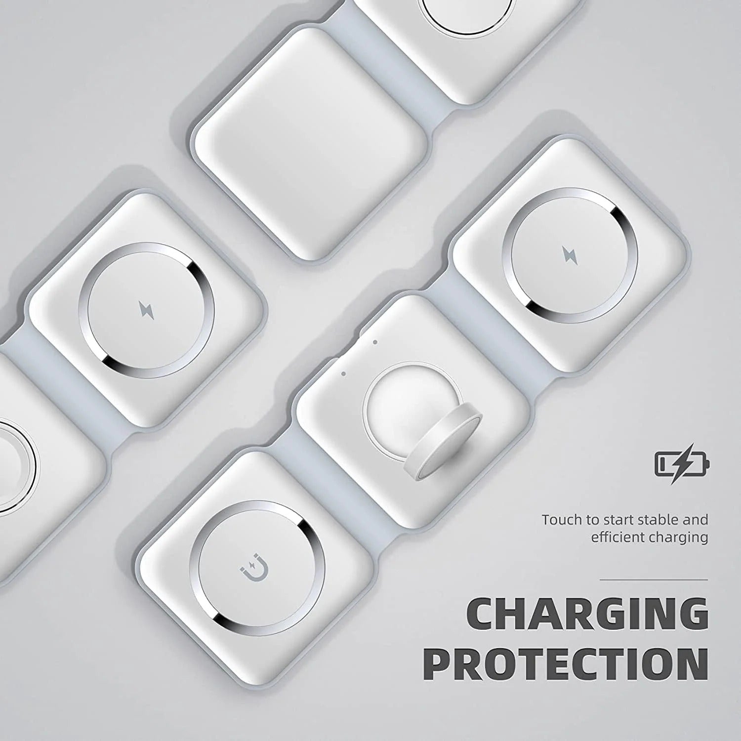لوحة شحن لاسلكية 3 في 1 تشحن هاتفك وسماعات الأذن وساعتك الذكية في آن واحد. استمتع بشحن سريع ومريح وخالٍ من الفوضى بتصميم أنيق وصغير الحجم.